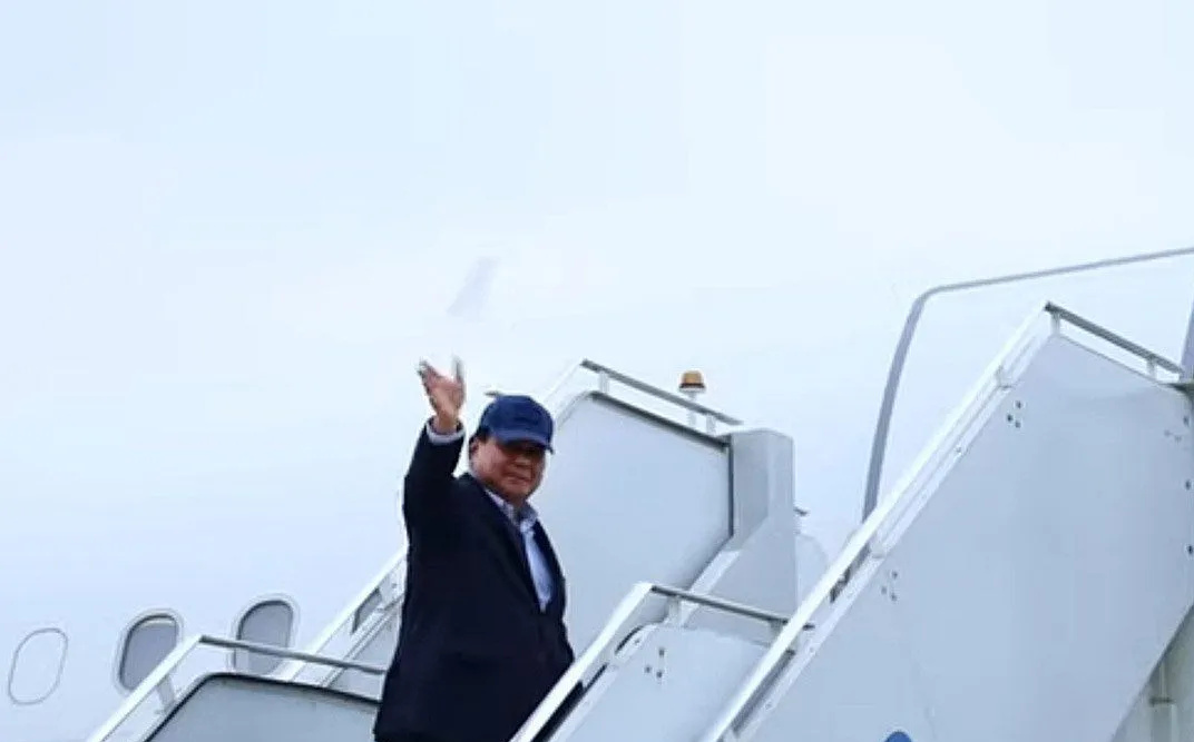 Presiden tampak menaiki pesawat kepresidenan dengan didampingi Menteri Luar Negeri Sugiono dan Sekretaris Kabinet Teddy Indra Wijaya.