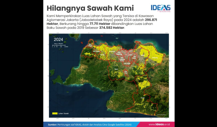 “Dengan metode digitasi tutupan lahan berbasis citra satelit ini, kami melakukan proses interpretasi dan digitasi secara on-screen untuk menghasilkan peta tutupan lahan (sawah) di wilayah aglomerasi Jakarta,” ujar Sri Mulyani, Peneliti IDEAS dalam keterangan tertulisnya pada Senin (03/02/2025).